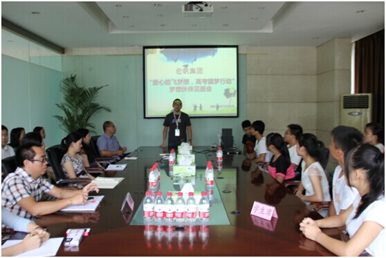 為給予貧困高考生更多精神上的支持和幫助,由重慶晨報、重慶市江北區綠葉義工志愿者協(xié)會(huì )共同發(fā)起了一場(chǎng)“全城尋找夢(mèng)想伙伴” 的愛(ài)心行動(dòng),2014年8月12日下午,“愛(ài)心助飛夢(mèng)想,高考圓夢(mèng)行動(dòng)”夢(mèng)想伙伴見(jiàn)面會(huì )在宏帆集團前廳會(huì )議室舉行,活動(dòng)由綠葉義工事務(wù)部總監黃楊主持,來(lái)自重慶山區的15名貧困高考生和15名宏帆集團員工參加了此次活動(dòng)。