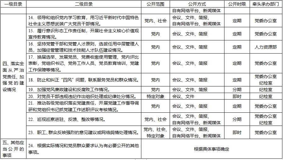 第五條 公司黨委及所屬各級黨組織貫徹落實(shí)黨的基本理論、基本路線(xiàn)、基本方略情況,領(lǐng)導經(jīng)營(yíng)生產(chǎn)、改革發(fā)展情況,落實(shí)全面從嚴治黨責任、加強黨的建設情況,以及黨的組織職能、機構等情況,除涉及黨和國家秘密不得公開(kāi)或者依照有關(guān)規定不宜公開(kāi)的事項外,一般應當公開(kāi)。