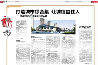 4月8日,在中外知名企業(yè)四川行活動(dòng)中,集團與四川省平昌縣成功簽約該項目總占地約200畝,緊靠縣城商業(yè)中心和行政中心,預計總投資約20億元,將建成集商業(yè)、寫(xiě)字樓、步行街、百貨、酒店為一體的城市綜合集,成為未來(lái)平昌縣城的標志性建筑。